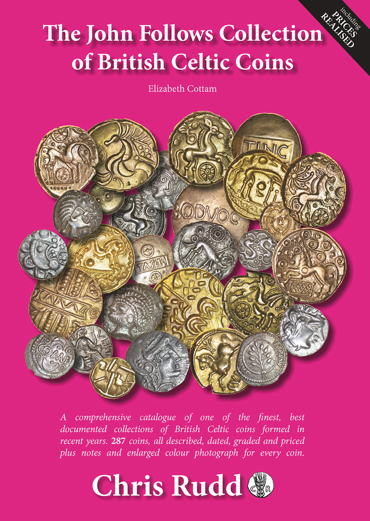 The John Follows Collection of British Celtic Coins is a big new hardback full of fresh information and expert insights you won’t find in any other book. It catalogues one of the finest private collections of British Iron Age coins, especially gold, since those of Evans (1823-1908), Lockett (1873-1950) and Mack (1901-74). Mostly bought direct from metdets. All with large colour photos, all with recent prices realised (2020-2025). ‘A beautiful book, almost a guide to ancient British coinage in itself, with many examples and variants not in any of the standard books’ (DR DAPHNE NASH BRIGGS, author of Coinage in the Celtic World). ‘Beautifully written and stunningly illustrated’ (DAVID R SEAR, author of Roman Coins and their Values). ‘Each coin is beautifully presented…expert technical information…an enjoyable read and an invaluable resource’ (DR DAVID ROBINSON, author of Durotrigan Quarter Staters). ‘An important reference book, lavishly illustrated and detailed…an outstanding and exceptional work’ (JULIAN EVAN HART, editor of Treasure Hunting magazine). ISBN 978-0-9566889-7-2, A4 hardback, 30x21cm, 155pp, 600 enlarged coin images. For more information click here