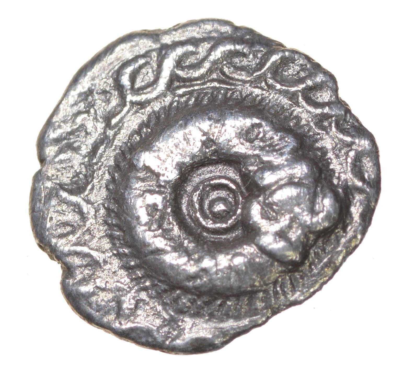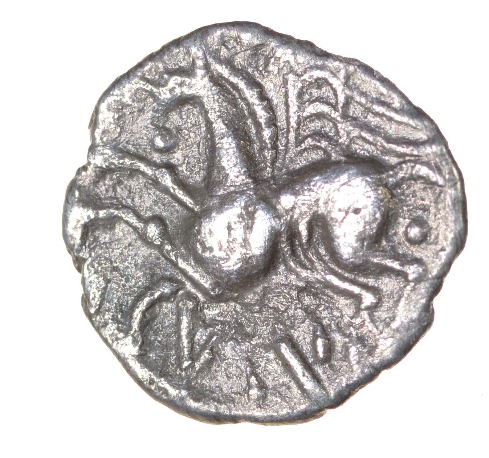 Cunobelinus Serpent Pegasus. c.AD 8-41. Silver unit. 11-13mm. 0.82g. Coiled ram-headed serpent, serpentine outer space./ Pegasus facing left, CVN below. ABC 2834, VA—, BMC 1857, S 300. Good VF, lightly toned, crisp strike, clear inscription. Ex Anthony Levine collection. Was £475. Now only £425