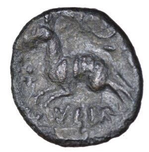 Tasciovanos Sea Horse. c.25 BC-10 AD. Bronze unit. 15mm. 2.14g. Head facing right with long hair and beard./ Fish-tailed sea horse facing left, VIIR below. ABC 2658, VA 1707, BMC 1714-21S 243. CCI 05.0374 (this coin). Very fine, lovely dark patina, clear sea-horse. Ex Anthony Levine collection, bt. Chris Rudd (2017), ex John Lumley collection, bt. Chris Rudd (2005), ex S Kelly collection, bt. CR (2001). Found Essex, 2000. RARE. Was £100. Now only £85