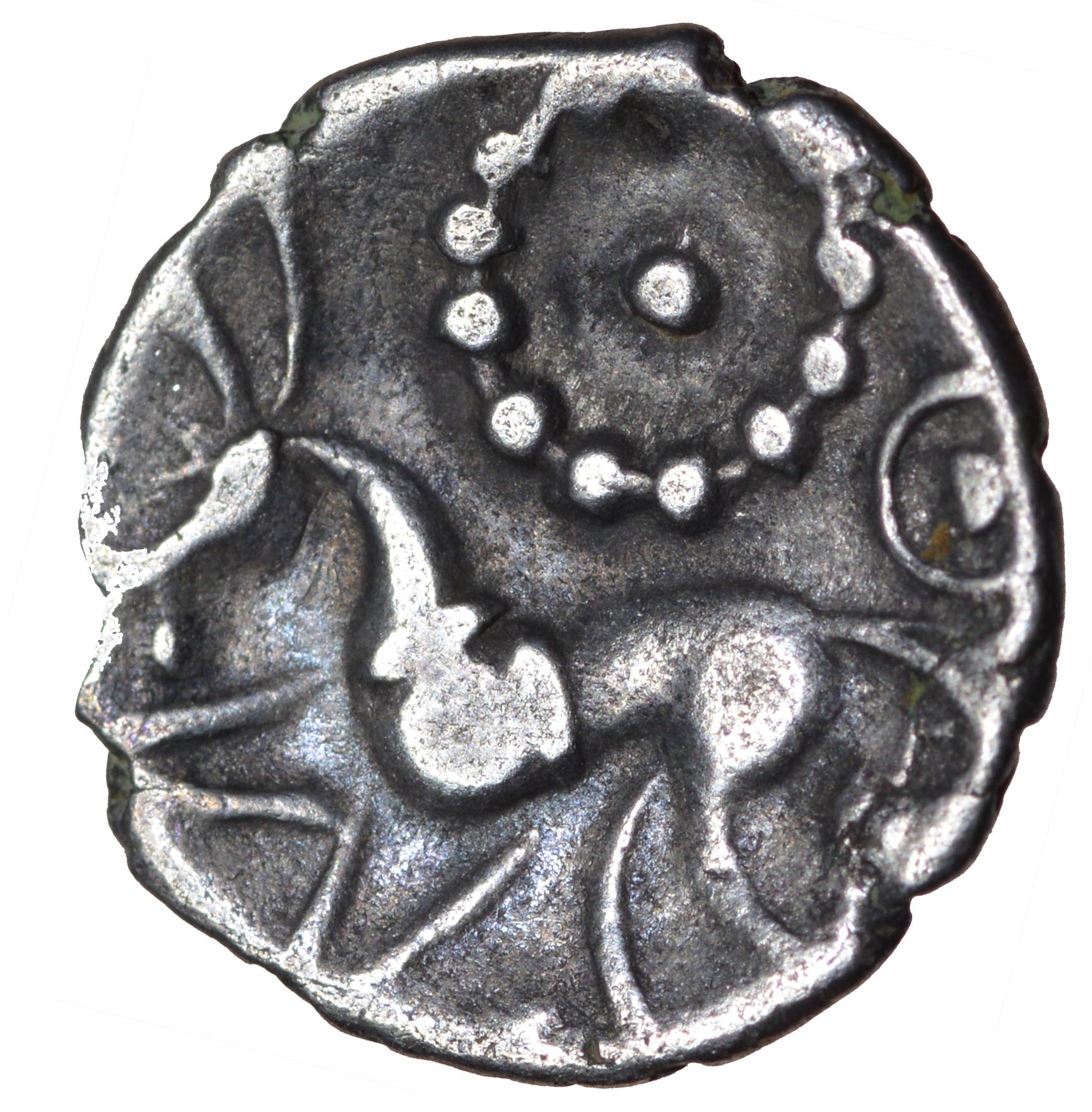 South Ferriby Natural Head Left. Rich Type 27b. c.55-45 BC. Silver unit. 14mm. 0.97g. Plain. / Horse left, belted neck and belly, beaded pellet and ringed pellet above, pellet below tail. ABC—, VA 887.1, BMC—, S–. Gd VF, lightly toned silver, bold horse and detail. Ex Luke Daniel collection. EXTREMELY RARE only 14 others recorded.                  Was £295. Now only £275