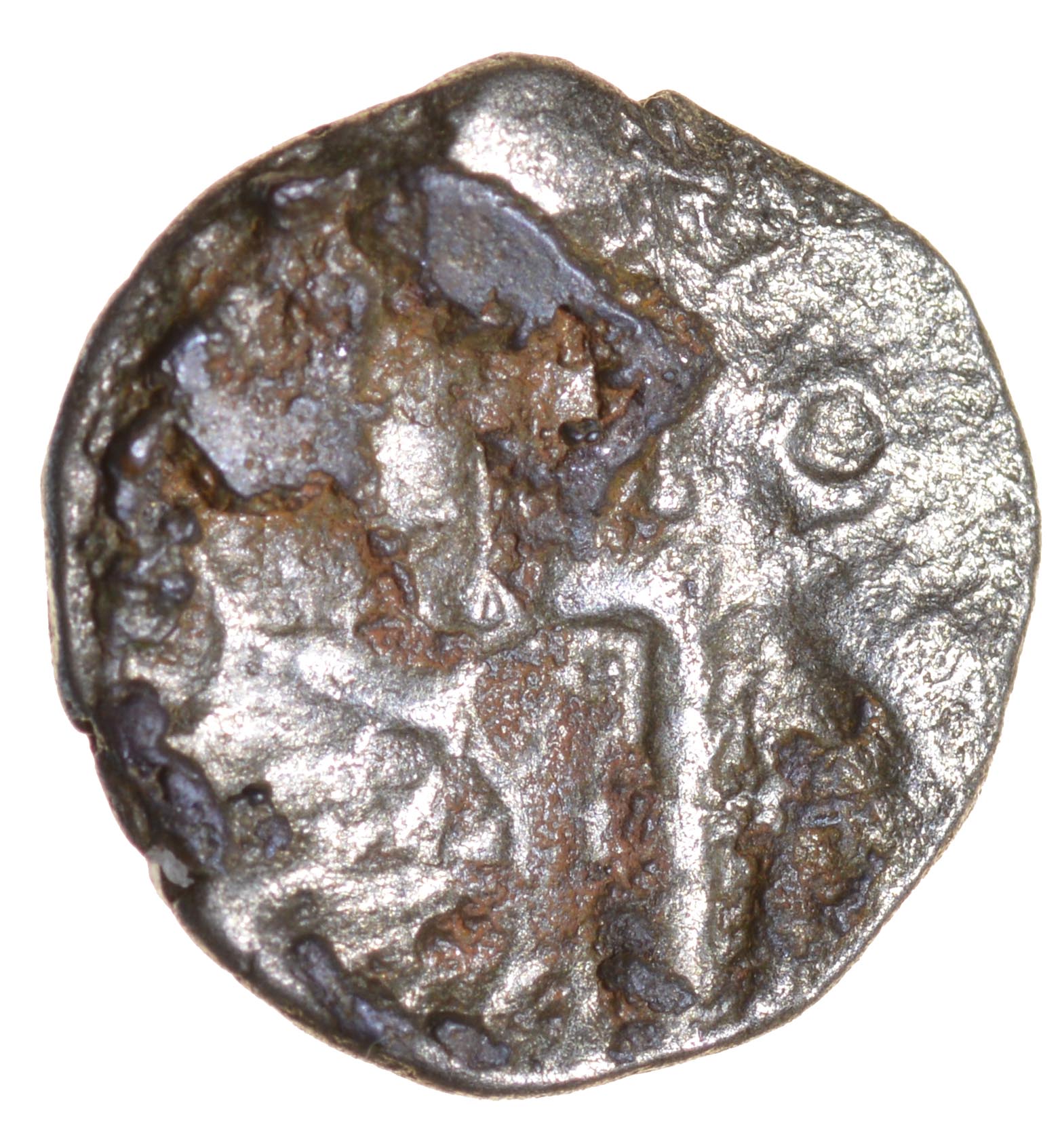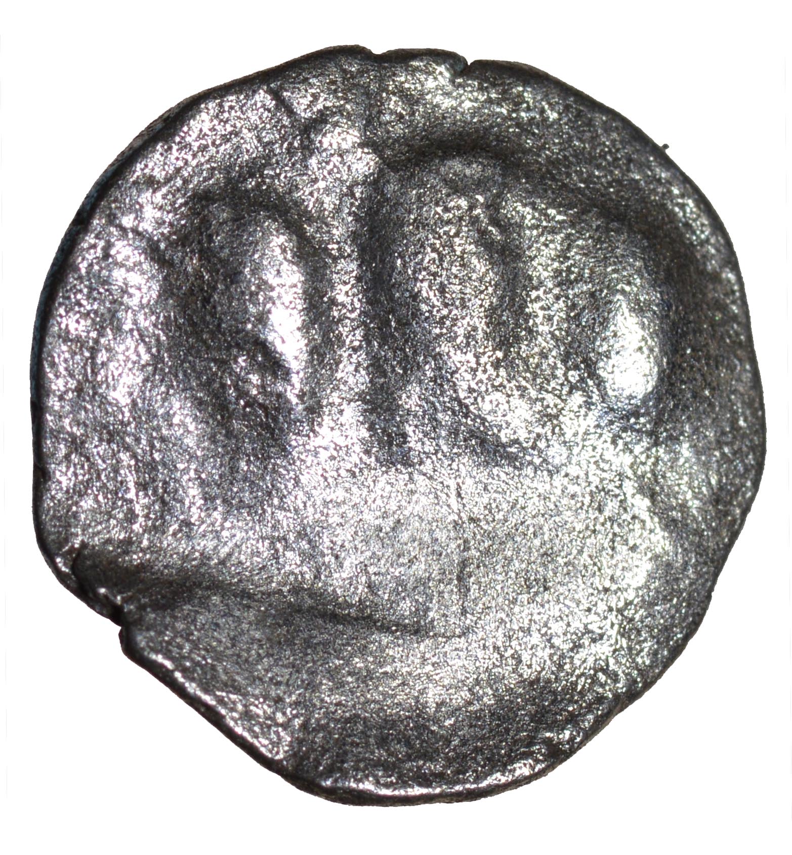Duro Thunderbolt. c.20 BC-AD 20. Silver quarter stater. 13mm. 0.75g. Trace of three men in boat./ Zigzag thunderbolt, clamshell motif bottom left, ring top right. ABC 2217, VA−, BMC 2771-79, S 368. VF/Nr VF, visible thunderbolt and clamshell. Ex JC collection. Found Tonbridge, Kent. Was £30. Now only £15